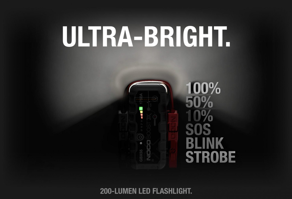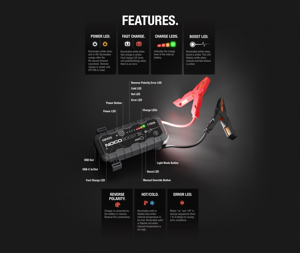 A NOCO GBX55 Boost X egy hordozható lítiumos indításrásegítő 12 voltos akkumulátorokhoz, legfeljebb 7,5 literes benzinmotorokhoz és 5,0 literes dízelmotorokhoz, beleértve személygépkocsikat, motorkerékpárokat, teherautókat, ATV-ket, csónakokat, lakóautókat, furgonokat, terepjárókat, traktorokat és még sok más járművet.