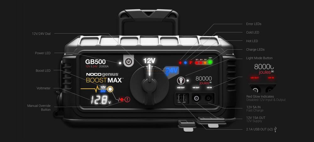 A NOCO GB500 12/24V MAX UltraSafe egy hordozható lítium-ionos akkumulátorral ellátott indítárásegítő, amely 6 250 amperrel másodpercek alatt "életre kelti" a lemerült akkumulátort. Hordozható áramforrásként is használható USB-eszközök - például okostelefonok, táblagépek és egyéb eszközök feltöltéséhez, vagy 12 voltos eszközök - például elektromos pumpa, áramátalakító és sok más eszköz táplálásához. Benzin- és dízelmotorokhoz 45 literig, beleértve a 6, 8, 12, és 16 hengeres nyerges vontatókat, lakókocsikat, autóbuszokat, bányászati, mezőgazdasági, építőipari és szakmai felszereléseket és még sok mást.