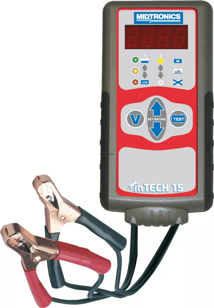 A Midtronics inTECH 15 mérőműszer megbízhatóan vizsgálja a 12V-s ólom-sav akkumulátorokat. A teszter néhány másodperc alatt megméri az indító akkumulátor indítási képességét. A teszteredmény a kijelzőn jelenik meg. Az inTECH 15 lehetőséget kínál az EN, DIN, IEC, SAE, CCA indítóáram szabványok szerinti tesztelésre 200-900A (EN, SAE), 120-550A (DIN, IEC) és 200-850A (SAE) tartományban. A vizsgált akkumulátorok vizsgálati módszerét a Midtronics több mint 39 szabadalommal védi a világon.