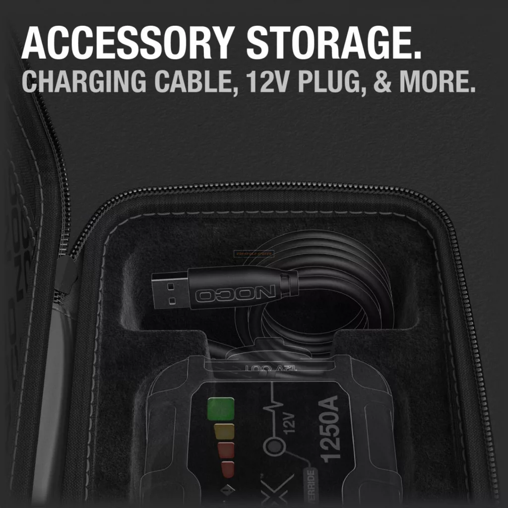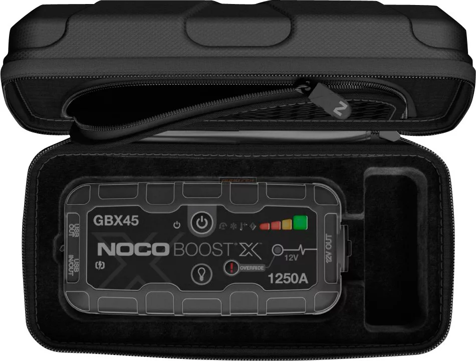 A Noco GBC101 EVA védőtáska a Noco GBX45 UltraSafe lítiumos indításrásegítőkhöz tartós és strapabíró, félmerev, egyedi külsővel, cipzáras záródással és megerősített fogantyúval rendelkezik. A gumírozott EVA külső védelmet nyújt a nedvességtől, ütődésektől, portól és egyéb környezeti tényezőktől, míg a formázott belső rész tökéletesen illeszkedik, tárolja és védi a hozzá tartozó NOCO Boost X UltraSafe indításrásegítőt - a GBX45 külön megvásárolható, nem tartozéka a csomagnak. A GBC101 tok további zsebekkel rendelkezik a kapcsolódó Boost tartozékok szállítására, tárolására. A védőtáskát könnyedén tárolhatja a csomagtartóban, járművében vagy garázsában.