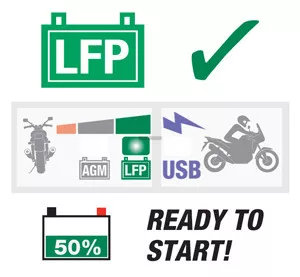 A beépített védelem kikapcsolja az USB-s töltést, megakadályozza a parkoló jármű LFP (LiFePO4) vagy AGM (Pb) akkumulátorának lemerülését – Visszakapcsol, ha a jármű motorja beindul.