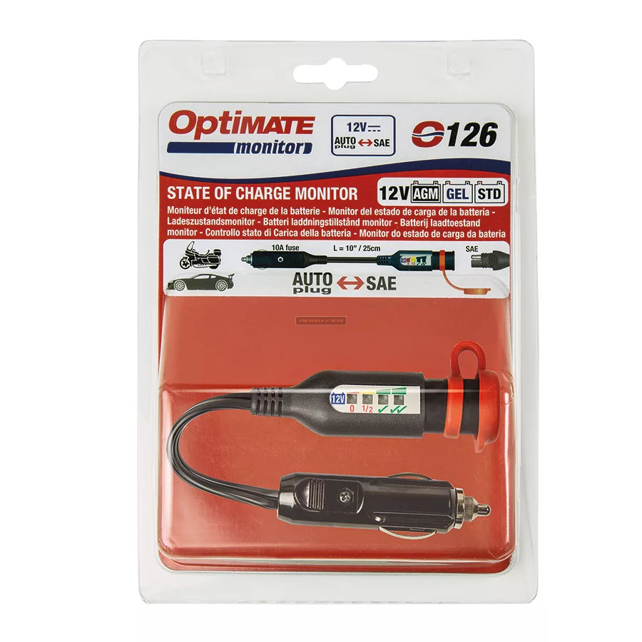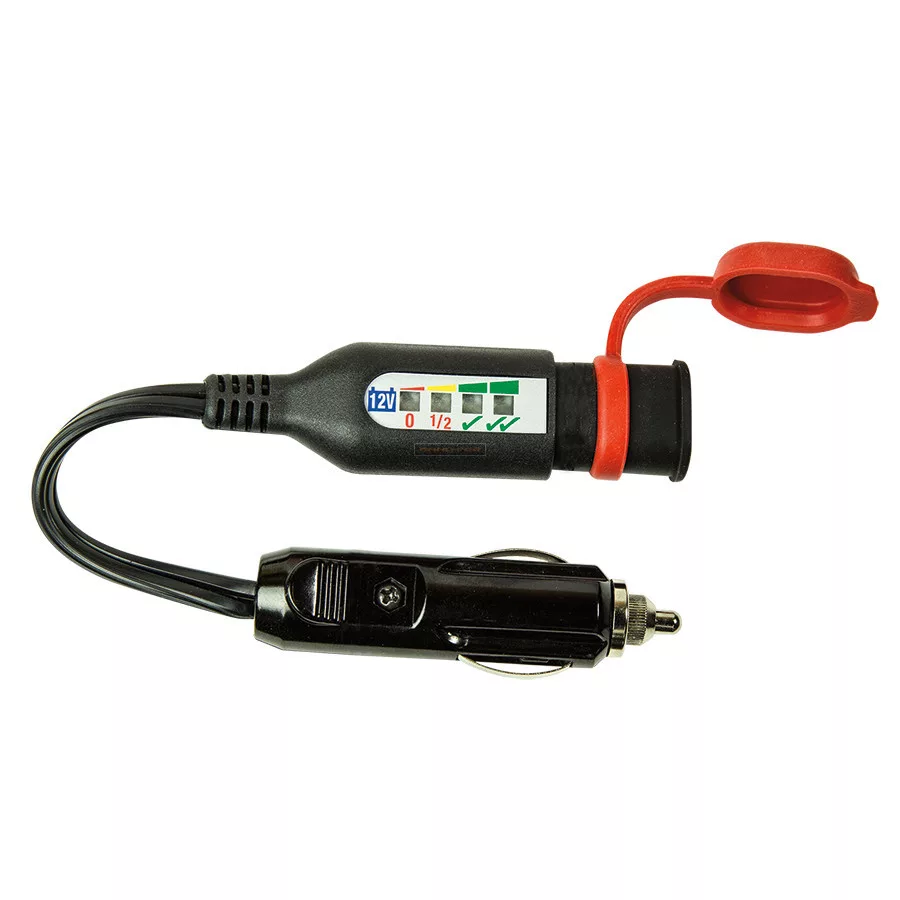 O-126 - Akkumulátor állapot/töltési rendszer figyelő 12V ólom-savas akkumulátorokhoz, AUTO csatlakozóval. SAE-AUTO 12V-os aljzatadapter töltöttségi állapotfigyelővel, amely közvetlenül a motorkerékpár, ATV/SxS, autó, kisteherautó vagy hajó 12V-os tápcsatlakozójához csatlakozik.