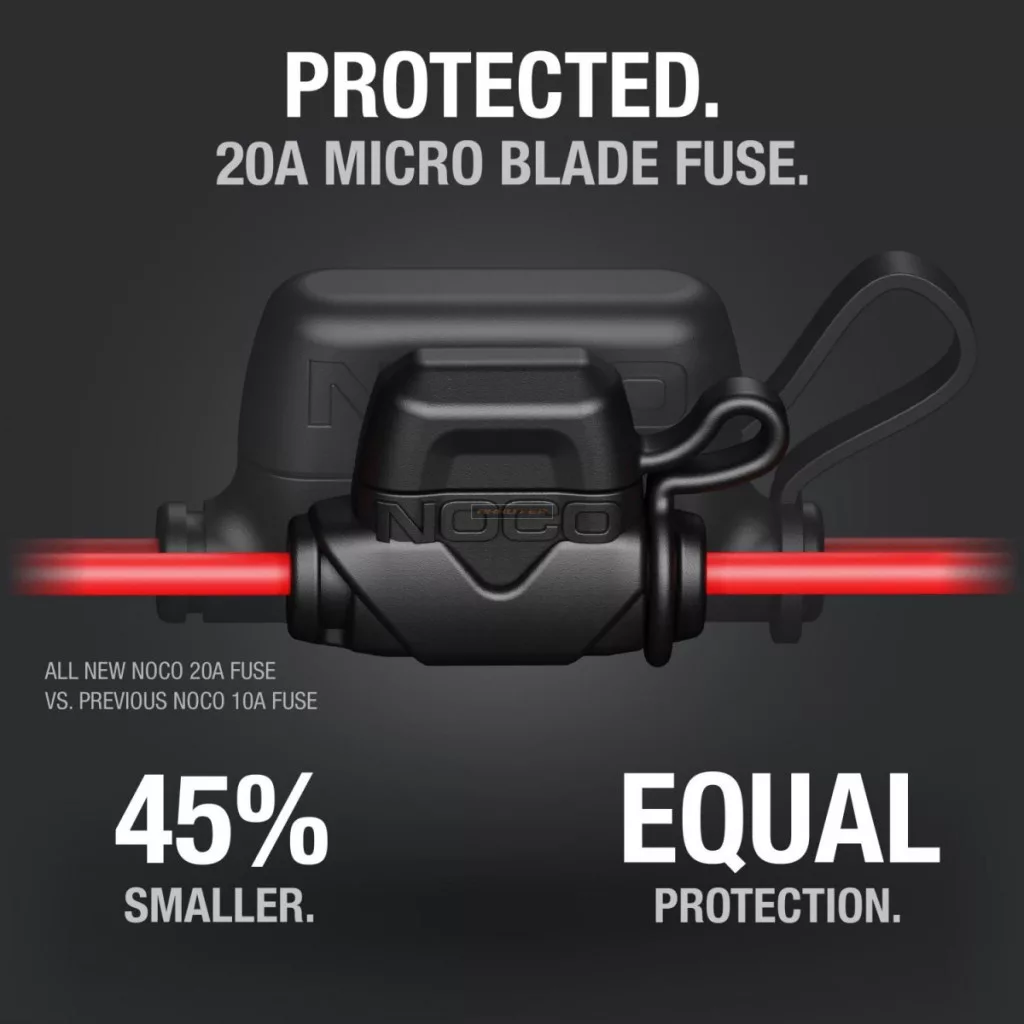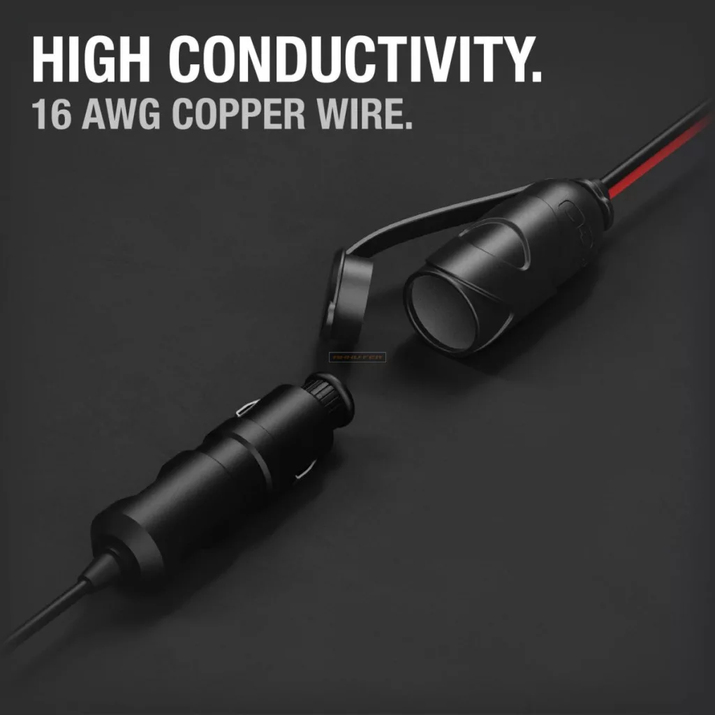 A Noco GC017 adapterdugó közvetlenül a 12V-s akkumulátorhoz csatlakozik a beépített akkumulátorkapcsokkal. Könnyedén táplálhatja kedvenc 12V-s eszközeit közvetlenül az akkumulátorról, például pumpát, porszívót, kávéfőzőt, ventilátort, hűtőt és még sok mást. A nagyobb biztonság érdekében biztosítékkal ellátott csatlakozókkal és vízálló kupakkal rendelkezik, amely megvédi a 12V-s aljzatot az időjárás viszontagságaitól. Nagy vezetőképességű, 16AWG 100 százalékos rézhuzalból készült, névleges kapacitása 15 amper.