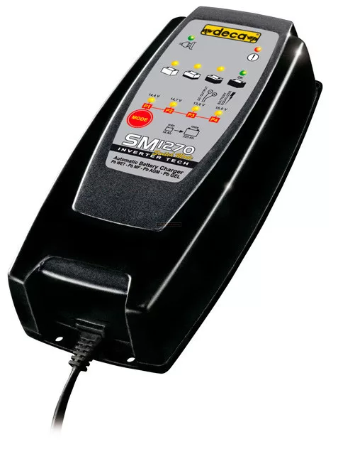 Deca SM 1270 - Hordozható töltő 12V-s ólom-savas akkumulátorok (zártrendszerű, gondozásmentes, klasszikus ólom-savas, zselés, VRLA) töltéséhez (impulzusos töltés). Töltőáram értéke 7A. Akkumulátor kapacitása 14-150Ah közötti. A töltő használatával meghosszabbíthatja akkumulátora élettartamát.