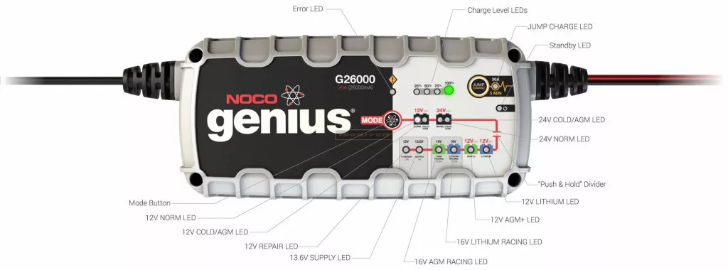 G26000 - Automata töltő 12/24V-s ólom-savas akkumulátorok (zártrendszerű, gondozásmentes, klasszikus ólom-savas, zselés, VRLA) és 12V-s Lítium akkumulátorok töltéséhez, valamint 12V-s akkumulátorokhoz indításrásegító funkcióval is rendelkezik. Maximális töltőáram értéke 15A. Akkumulátor kapacitása 50-500Ah közötti. Ideális megoldás otthoni használatra 12/24V-s ólom-savas akkumulátorokhoz, csepptöltő funkcióval, illetve 12V-s Lítium-ion akkumulátorokhoz. A töltő használatával meghosszabbíthatja akkumulátora élettartamát.